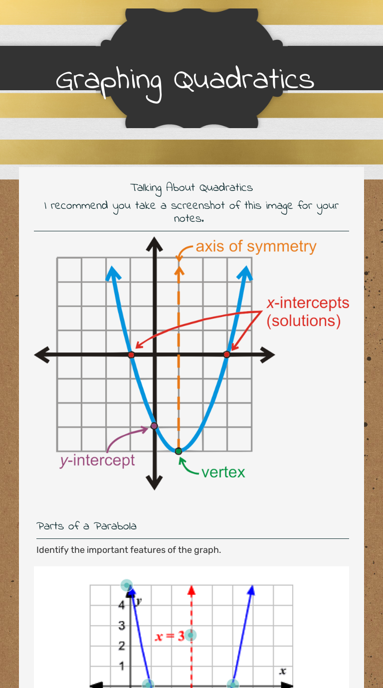 PDF Graphing Quadratic Review Worksheet Solutions Graphing Quadratics Review Worksheet Fill in each blank using the word bank. Name x-intercepts a Ola Œ¥.i-mum— zer 1. Standard form of a quadratic function is y 2. The shape of a quadratic equation is called 5. When the vertex is the highest point on the graph, we call that a 6. When the vertex is the lowest point on the graph, we call that a 7.