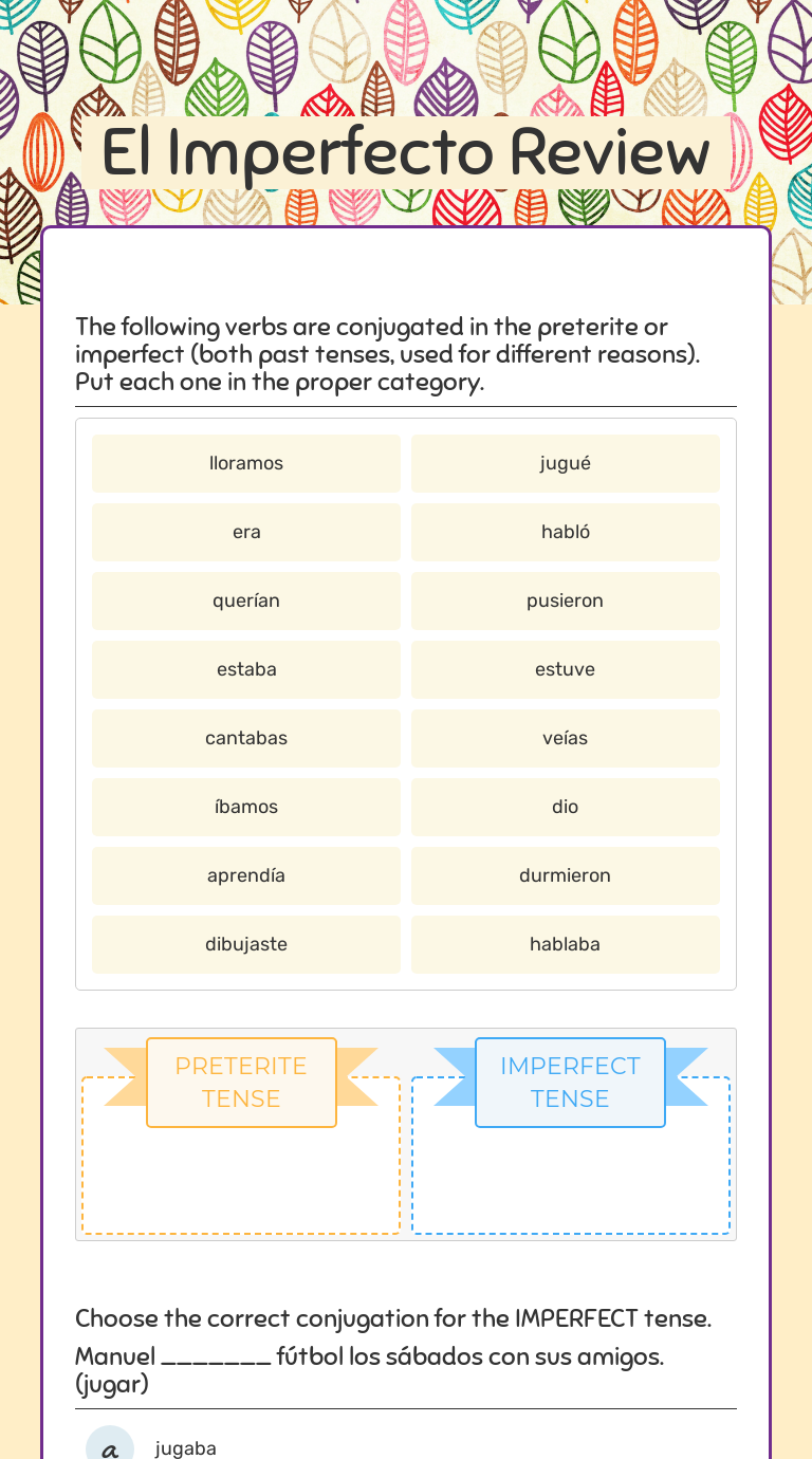 The imperfect tense in spanish worksheet answers. Spanish Worksheets PDF | SpanishBoat Free Spanish Worksheets in PDF with answers for Spanish teachers and students-- Download / print to use in classrooms, homework, etc. a8-neuwagen.de 21.02.2022 · email protected] The SPANISH VERB DRILLS The Big Book - CISD SPANISH VERB DRILLS The Big Book Of By Hanna Harb Grids and Exercises ::::: SPANISH VERB DRILLS 9 780756010942 ISBN 978-0-7560-1094-2 10000 The Big BooK of SPANISH VERB DRILLS The Only Verb Drill Book You’ll Ever Need! Packed into these 24 chapters are dozens of verb grids and exercises! Everything you need to drill different types of –ar, –er and … Imperfect Tense – Free Exercise - Lingolia Improve your Spanish with Lingolia. Each grammar topic comes with one free exercise where you can review the basics, as well as many more Lingolia Plus exercises where you can practise according to your level. Check your understanding by hovering over the info bubbles for simple explanations and handy tips. Imperfect Tense – Free Exercise