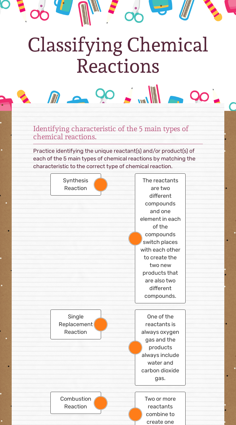 Classification of chemical reactions worksheet. Types Of Chemical Reactions Worksheet Answer Key ... some of the worksheets for this concept are types of chemical reactions work answers six types of chemical reactions work bill nye chemical reactions physical and chemical changes work grade 11 chemistry module 3 enthalpy of reaction h chem1101 work 10 enthalpy reactions of chapter 10 work and key chemical reactions. 3 pb 2 h 3 po 4 3 h 2 pb 3 po … Classifying Chemical Reactions Worksheets & Teaching Resources | TpT With this resource, students will use sorting cards to classify groups of chemical reactions, assign them a generic formula, a definition, and a name. They will t ... Also included in: Atoms and the Periodic Table Bundle - Includes 5 Student Workbooks! ... A 3-page worksheet that provides an ... Chemical Reactions - The Science Spot Popular Resources: NGSS - Find new resources to help you implement NGSS in your classroom. Visit my Forensic Science page to find lessons you can use in your current curriculum to target forensics. Explore the Kid Zone to find interactive sites and great resources for your students · Welcome ... Identifying Types Of Chemical Reactions Worksheet ... Six types of chemical reaction worksheet answers. A 2 nabr 1 ca oh 2 1 cabr2 2 naoh. C 4 c5h9o 27 o2 20 co2 18 h2o. 2 nh 3 h 2 so 4 nh 4 2 so 4 synthesis 3.