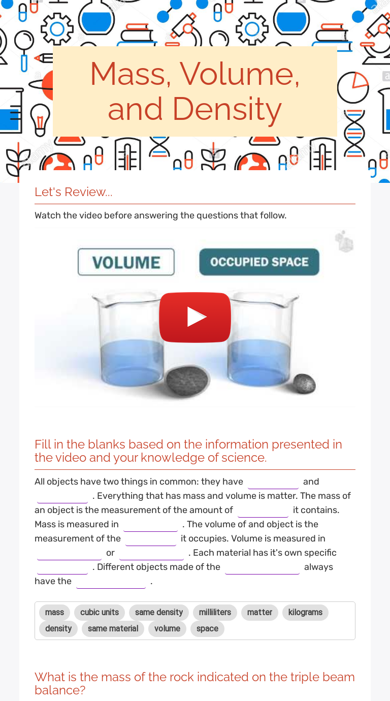 Measuring Matter worksheet ID: 450593 Language: English School subject: Science Grade/level: Grade 4 Age: 8-10 Main content: Measuring Mass and Volume Other contents: Measuring Tools Add to my workbooks (141) Download file pdf Embed in my website or blog Add to Google Classroom