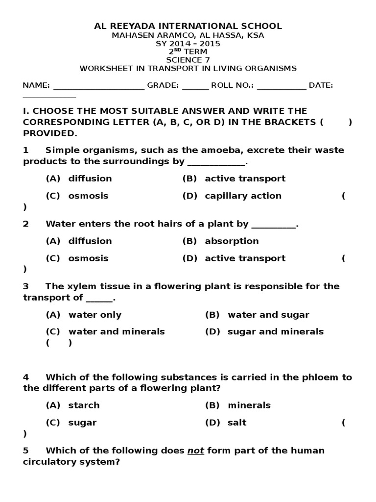 Pre-Lab 4 Worksheet - Plant Transport.pdf - PRE-LABORATORY ... Worksheet Name _____ Team Name _____ Exploring Water and Nutrient Transport in Plants 59 4 PRE-LABORATORY Unlike animals, which have to find and eat food to meet the energetic demands of life, plants are able to make their own food. This process, known as photosynthesis, allows plants to construct the organic molecules needed to fuel their energy demands and to build plant cells and tissues. Grade 7 Transportation in Animals and Plants Worksheets ... Grade 7 Transportation in Animals and Plants Worksheets. November 11, 2020 November 10, 2020 by worksheetsbuddy_do87uk. A. Match the following: 'A' 'B' 1. Stomata: a. Absorption of water: 2. Xylem: b. Transpiration: 3. Root hair: c. Transport of food: 4. Phloem: d. Transport of water: e. Synthesis of carbohydrates: B. Fill in the blanks ... Water Transport in Plants | Lesson Plan - Science Buddies This means that the plant has to transport the water from its roots up throughout the rest of the plant as shown in Figure 1. How do plants do this? The first step is taking up water from the soil through their roots, which are permeable, meaning they are great for absorbing water. ... Print out a worksheet for each student. CBSE Class 7 Science Transportation in Animals and Plants ... CBSE Class 7 Science Transportation in Animals and Plants Worksheets with Answers for Chapter 11 in PDF format to download prepared by expert Science teachers from latest edition of CBSE(NCERT) books. Register online for Science tuition on Vedantu.com to score more marks in your examination.