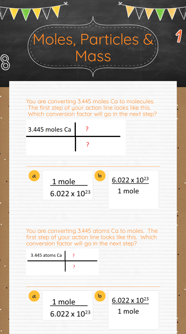 DOC Mole Conversion Worksheet Mole Conversion Worksheet Name:_____ There are three mole equalities. They are: 1 mol = 6.02 x 1023 particles. 1 mol = g-formula-mass (periodic table) 1 mol = 22.4 L for a gas at STP. Each equality can be written as a set of two conversion factors. They are: Step 1
