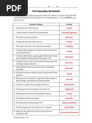 Cell Organelles Worksheet KEY | PDF | Cell (Biology ... Cell Organelles Worksheet Complete the following table by writing the name of the cell part or organelle in the right hand column that matches the structure/function in the left hand column. A cell part may be used more than once. Structure/Function 1. Stores material within the cell 2. Closely stacked, flattened sacs (plants only) 3.