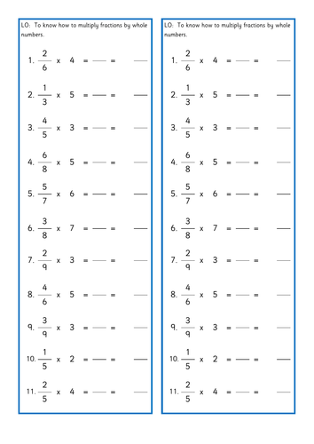 Multiplying Fractions By Whole Numbers Activity Students will practice multiplying whole numbers by fractions with this brilliant worksheet resource. Great for in-lesson activities or a homework task. Help your students to practice multiplying fractions by whole numbers with these helpful activity sheets. Read More...