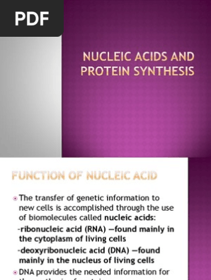 PDF Name Class CHAPTER 7 Nucleic Acids and Protein Synt Nucleic Acids and Protein Synthesis Section 7-3. SKILL ACTIVITY- Sequencing events. synthesis begins with DNA in the nucleus. Below is a DNA sequence that could code for part of a molecule of oxytocin. Write the sequence of messenger RNA (mRNA) codons that would result from... nucleic acid | Definition, Function, Structure, & Types | Britannica nucleic acid, naturally occurring chemical compound that is capable of being broken down to yield phosphoric acid, sugars, and a mixture of organic Nucleic acids are the main information-carrying molecules of the cell, and, by directing the process of protein synthesis, they determine the inherited... Chapter 10: Protein Synthesis. Biology - PDF Free Download Academic Nucleic Acids and Protein Synthesis Test Multiple Choice Identify the letter of the choice that best completes the statement or answers the question. Proteins and Nucleic Acids Chapter 5 Macromolecules: Proteins Proteins Most structurally & functionally diverse group of biomolecules. : o... Nucleic acids and protein synthesis between cellular nucleic acid and protein. A large number of experiments in. went a long way toward answering questions concerning the nature of the. genee The impact on biochemists protein synthesis from DNA synthesis; that is, inhibition of the synthesis. of DNA by ultra-violet light, x-ray...