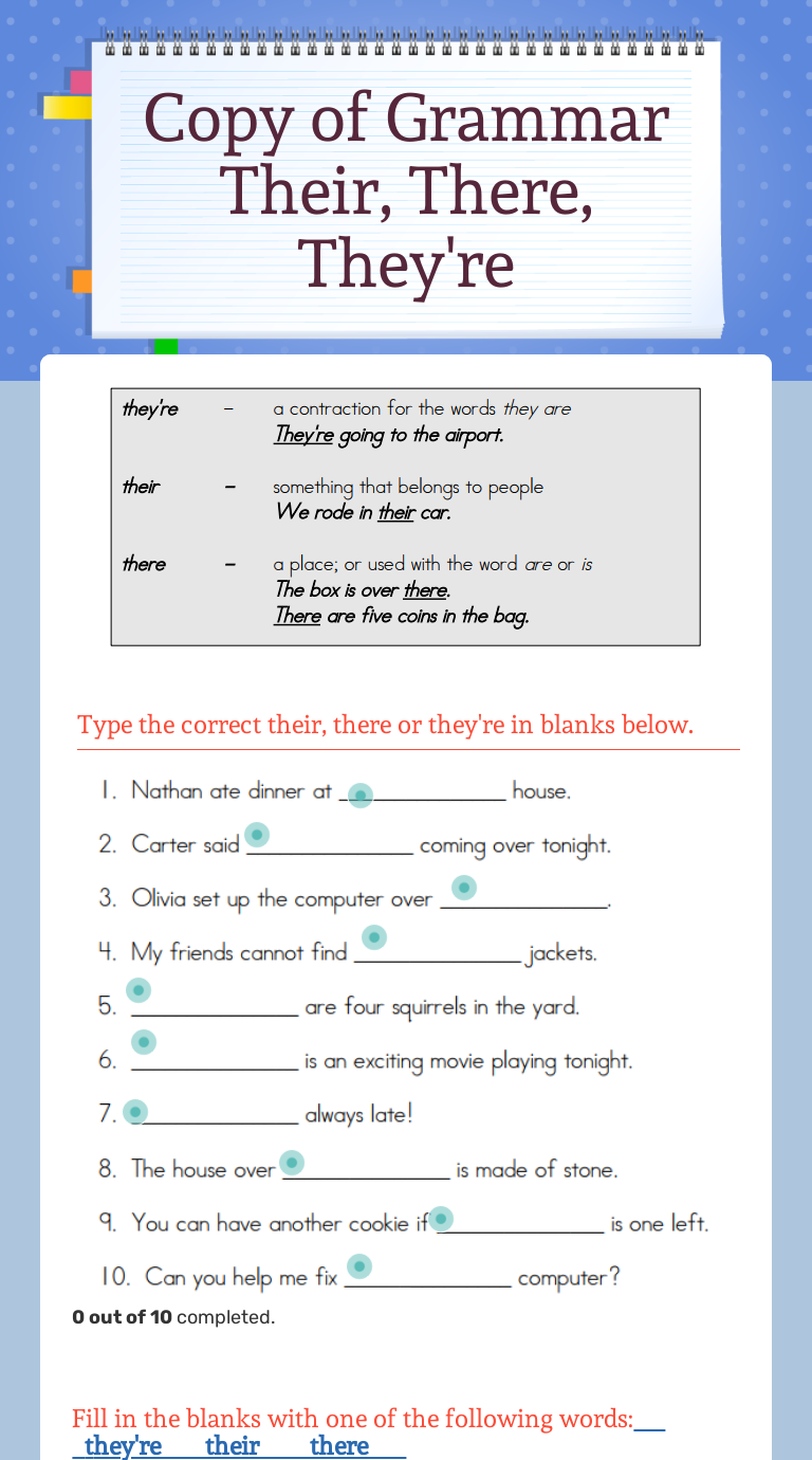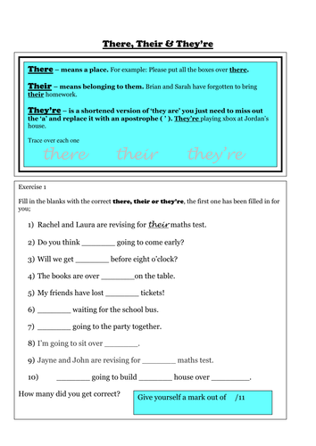 'There, Their & They're' Quiz - Exercise & Worksheet Test yourself with our free English language exercise about 'There, Their & They're'. This is a free beginner English grammar quiz and esl worksheet. Questions on 'There, Their & They're' with answers. There, their and they're worksheets and online exercises All worksheets Only my followed users Only my favourite worksheets Only my own worksheets. Live worksheets > English > English as a Second Language (ESL) > There, their and they're.