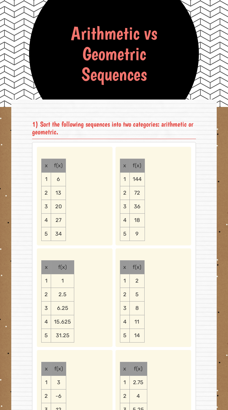 Arithmetic Sequence or Geometric Sequence worksheet Live worksheets > English > Math > Sequences > Arithmetic Sequence or Geometric Sequence. Arithmetic Sequence or Geometric Sequence. Arithmetic Sequence or Geometric Sequence. ID: 2447700. Language: English. School subject: Math. Grade/level: 10. Age: 11+. Geometric Sequences Worksheet With Answers - Sixteenth Streets Arithmetic sequence worksheet with answers. A 20) a _4, r = 4 next 3 terms: Arithmetic and geometric sequences worksheet answer key.worksheet by kuta software llc secondary math 1 4 3 arithmetic and geometric sequences worksheet name date period q y2q0g1f5a pkpuztyav dsaozfmtzwqagrqes dlvlucu r j wall lg yrsixg hwths sr ezsqeirnvreede 1 for each sequence state if it is arithmetic geometric or ... PDF Arithmetic and Geometric Sequences Practice Homework Arithmetic and Geometric Sequences Practice Homework For each Sequence, Pattern, Table, or Story below identify whether it is Arithmetic or Geometric, find the common difference or common ratio, write an Explicit Formula, then use your formulas to find the given term. Representation Arithmetic or Geometric Common Difference or Ratio PDF Geometric Sequences Date Period Given the first term and the common ratio of a geometric sequence find the first five terms and the explicit formula. 15) a 1 = 0.8 , r = −5 16) a 1 = 1, r = 2 Given the first term and the common ratio of a geometric sequence find the recursive formula and the three terms in the sequence after the last one given. 17) a 1 = −4, r = 6 18) a 1 ...