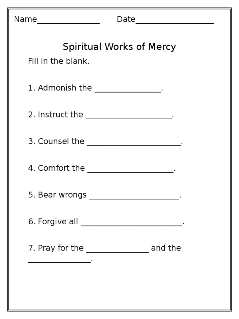 Catholic Works Of Mercy Worksheet - Corporal Works Of ... Works of mercy the catechism of the catholic church, paragraph 2447 reads: Some of the worksheets for this concept are the spiritual works of mercy read each example below and, works of mercy, diocese of orlando works of mercy activities appendix, introduction to the corporal and spiritual works of mercy, works of mercy, works of mercy project ...