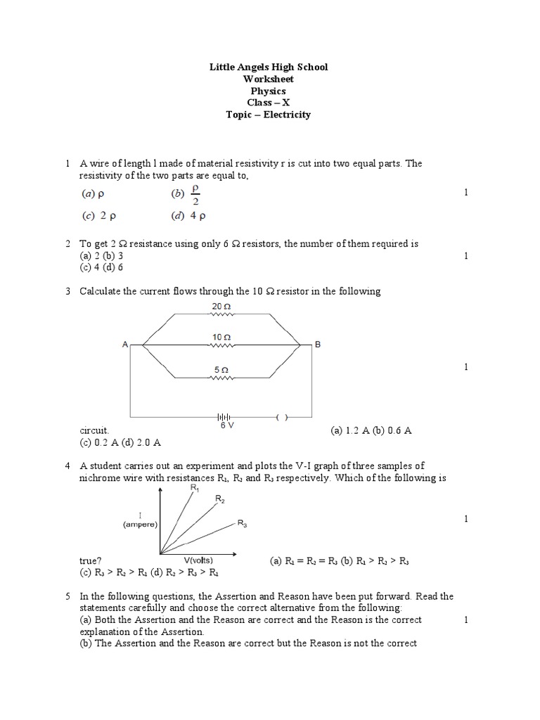 Worksheets on Electricity for class 10 Electricity Worksheet-1. A piece of wire of resistance R is cut into five equal parts. These parts are then connected in parallel. If the equivalent resistance of this combination is R', then the ratio R/R' is : A. 1/25 B. 1/5 C. 5 D. 25. PDF Circuit Worksheet (answers) - themcclungs.net Circuit Worksheet Answers side 1 For each of the given circuits, calculate the equivalent resistance. Then, calculate the total current. Finally, calculate the individual currents and voltages for each resistor. Circuit 1 R1 R2 R3 Vtotal R I V R1 3 Ω 1 3 Vtotal = 9 v R2 3 Ω 1 3 Itotal = 1 R3 3 Ω 1 3 Rtotal = 9 Circuit 2 Vtotal R1 R2 R3 R I V ... Equivalent Resistance Worksheet - Pinterest Description Worksheet consist of questions on finding equivalent resistance of various circuits. Answer key also included. Your learners will have fun to answer ... Series and Parallel Circuits Worksheet Series and Parallel Circuits Worksheet. Use the chart to answer each of the following questions. Be sure to place a box around the calculated values requested. A 20 Ohm lamp and a 5 Ohm lamp are connected in series and placed across a potential difference of 50 V. What is the equivalent resistance of the circuit?