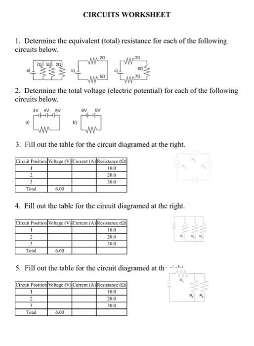 CIRCUITS WORKSHEET - WPMU DEV CIRCUITS WORKSHEET 1. Determine the equivalent (total) resistance for each of the following circuits below. 2. Determine the total voltage (electric potential) for each of the following circuits below. 3. Fill out the table for the circuit diagramed at the right. Circuit Position Voltage (V) Current (A) Resistance (Ω) 1 10.0 2 20.0 DOCX CIRCUITS WORKSHEET - St. Louis Public Schools CIRCUITS WORKSHEET. 1. Determine the equivalent (total) resistance for each of the following circuits below. 2. Determine the total voltage (electric potential) for each of the following circuits below. 3. Fill out the table for the circuit diagramed at the right. Equivalent Resistance Worksheet - southingtonschools.org What is the total resistance, R t, of the three resistors? R t = R 1 + R 2 + R 3 5. Three resistors with values of 3.0 Ω, 6.0 Ω, and 12 Ω are connected in series. What is the equivalent resistance of this combination? 21 Ω 6. Three resistors with values of 4.0 Ω, 6.0 Ω, and 10.0 Ω are connected in parallel. What is their equivalent resistance? 1.9 Ω 7.