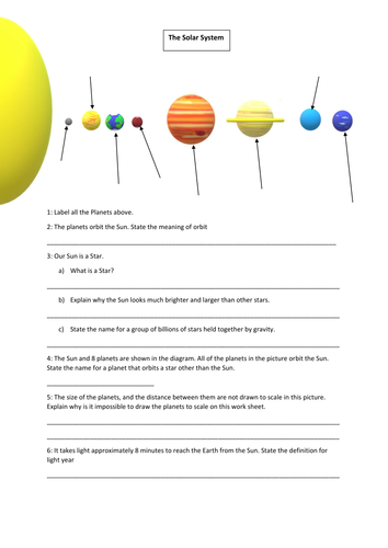 Label the solar system worksheet ID: 2159239 Language: English School subject: Science Grade/level: 4-5 Age: 8-12 Main content: Label the solar system Other contents: Label the solar system Add to my workbooks (1) Download file pdf Embed in my website or blog Add to Google Classroom Label Solar System Worksheets & Teaching Resources | TpT Label Solar System Worksheet by Alexis Forgit 21 $1.50 PDF Students label the major bodies in our solar system (including the sun, Mercury, Venus, Earth, Mars, Asteroid Belt, Jupiter, Saturn, Uranus and Neptune). I have my students color the planets in the correct colors as an addition to the worksheet. Includes the answer key. Planets of the Solar System Differentiated Worksheets Jupiter is the biggest planet in our solar system. The fifth planet from the sun, Jupiter has an approximate diameter of 88,695m (142,800 km) which is roughly 11 times the size of Earth!