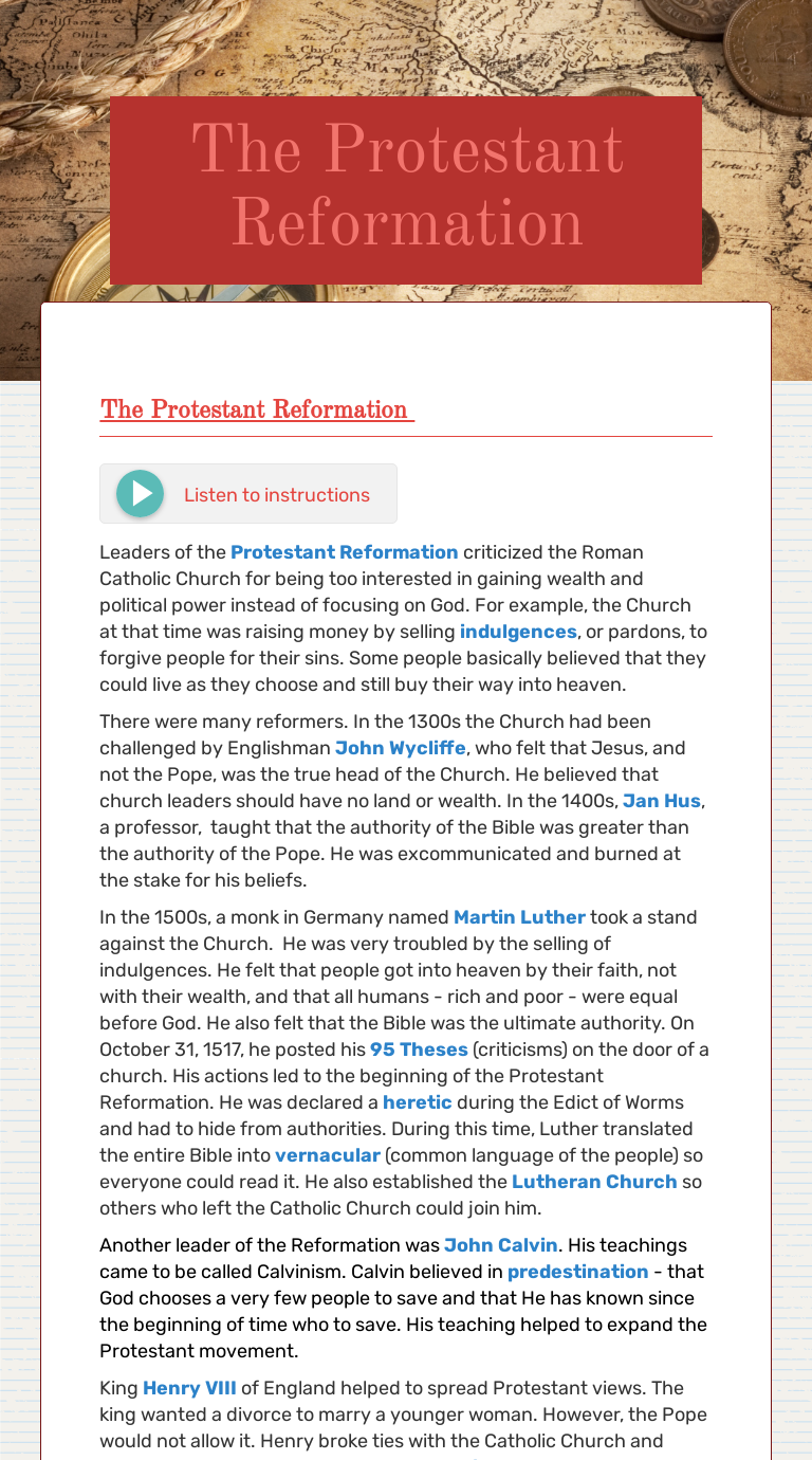 PDF Martin Luther and the Reformation Rotation Sunday School ... The lesson set is focused on Martin Luther and the Reformation in Germany. Each set of lessons includes a lesson in Art, Music, Games, Drama, Publication and Movies. The students will hear each week a different facet of the story of Martin Luther's rediscovery of the Good News of God's forgiveness and love Reformation - World history George - Google Search Renaissance's worksheet. Rome. Early Rome. Punic war. Rome empire. Work sited. World religions. Buddhism. Christianity. Confucianism. ... Luther Leads the Reformation. ... People expect higher standards of conduct from priests and church leaders.