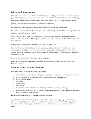 Birth control methods | Office on Women's Health Birth control methods Birth control (contraception) is any method, medicine, or device used to prevent pregnancy. Women can choose from many different types of birth control. Some work better than others at preventing pregnancy.