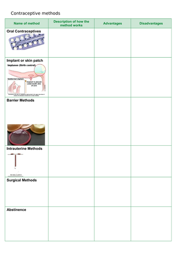 Contraceptives Worksheets & Teaching Resources | TpT This 33 term worksheet will help your students to learn about contraceptives (also includes terms associated with contraception). Ideal for a Health or Advanced Health course and can be used as a pre-test, classwork assignment, assessment, or review. Can be used with other Health worksheets. Word. Subjects: