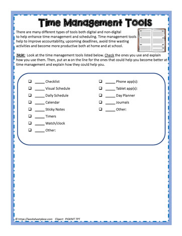 Time management worksheet for students. 5 Reasons Why Time Management is Important - Develop Good … 10/02/2020 · 7 Free Time Management Worksheet for Students & Adults; 7 SMART Goals Examples for Time Management & Productivity ; 11 Time Management Activities & Exercises; You also need to know when to stop. Putting time limits on your work will help you compartmentalize tasks and prevent you from allowing one project to take over all of your time. … Printable Time Management Sheets Download your 1:1:5 values-goals-action time management worksheet (PDF file). Time management activity: Once you have completed this sheet for each of the goals that are important to you, look back on your master to do list and see how many next logical actions align with any of these actions that support your longer term goals. Time Management Lesson Plan — Making Caring Common Sep 20, 2019 · As children get older, they encounter increasingly complex academic, social, athletic, and familial demands on their time which can be difficult to navigate. Help your students learn how to prioritize and balance their commitments with this time management lesson plan. Total time: 1-1.5 hours over 2-3 sessions. Free Worksheet Maker - Create Worksheets Online | Canva Help your students review and build knowledge with custom worksheets. An effective way to ensure students explore new topics and practice new skills on a daily basis is by answering worksheets. Whether you are teaching vocabulary, writing, science or math, you can easily create worksheets that match the lessons for the day.