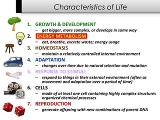 Characteristics Of Life Activities Teaching Resources | TpT This no-prep activity involves matching the characteristics of life (cellular organization, homeostasis, uses energy, grows and develops, reproduces, responds to stimuli) to defining traits and images. It can be used as a hands-on sort and match or cut apart and glued into an interactive notebook.