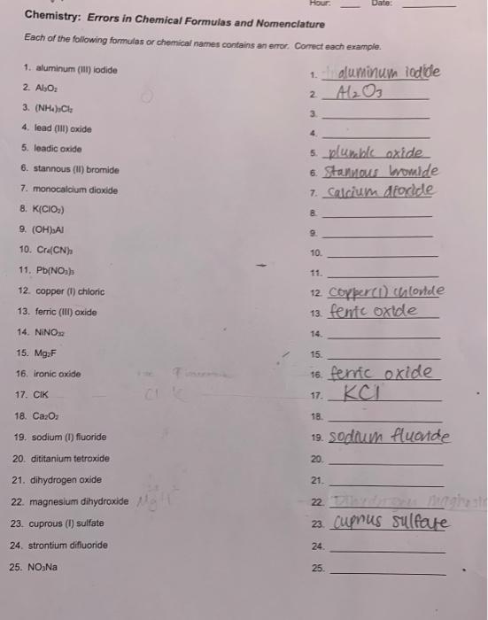 Errors in Nomenclature - Chemistry KEY. Chemistry: Errors in Chemical Formulas and Nomenclature. Each of the following formulas or chemical names contains an error. Correct each example.