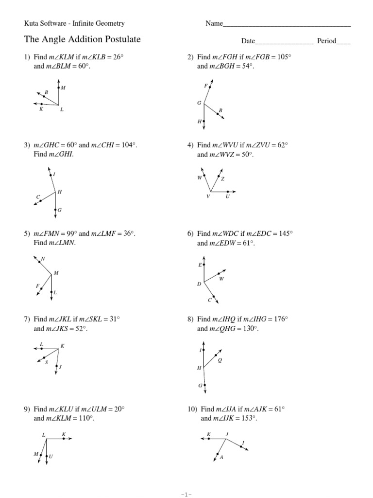 Angle Addition Postulate Worksheet.pdf - Kuta Software View Angle Addition Postulate Worksheet.pdf from MATH 102 at The City College of New York, CUNY. Kuta Software - Infinite Geometry Name_ The Angle Addition Postulate 1) Find m∠KLM if m∠KLB = 26° and ... Correct Answer; Numerical digit; University of the People • MATH 1302. Self-Quiz Unit 2_4.pdf. 6. 8DEEBEE0-D767-4A4C-AD1C-0A9BF6BACCE9 ...