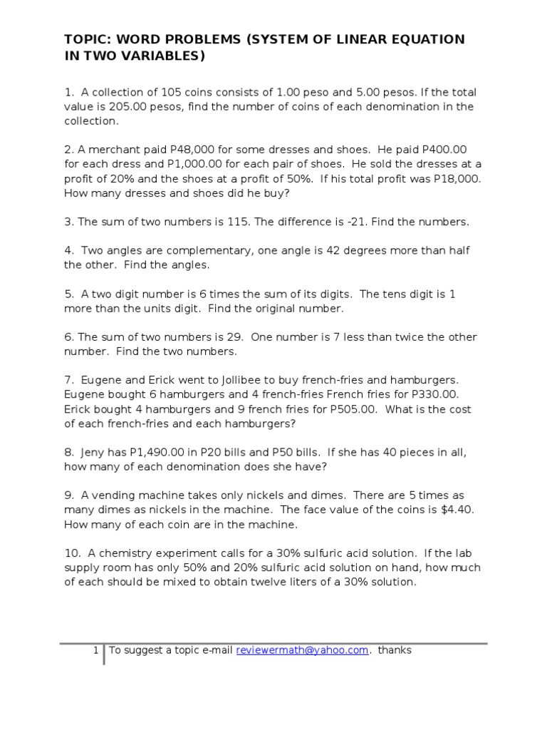 Systems of Equations Word Problems worksheets - Testinar This page includes printable worksheets on Systems of Equations Word Problems. You can access all of them for free. This versatile worksheets can be timed for speed, or used to review and reinforce skills and concepts. You can create math worksheets as tests, practice assignments or teaching tools to keep your skills fresh.